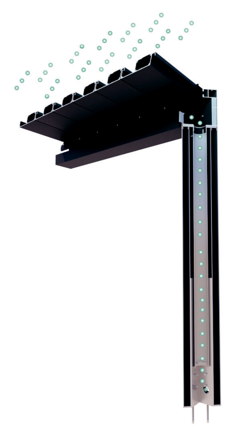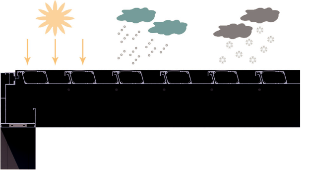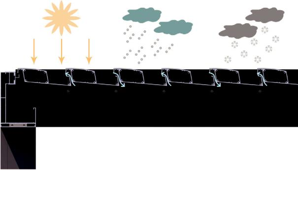 Euro Premium Pergola is designed in a way to collect rainwater and channel it to the side beams of the louver... Then, the rainwater through the mullion is guided outside of the construction... The louver’s profile is studied to keep the rain drops that is collected and not fall down when the louvers start moving...